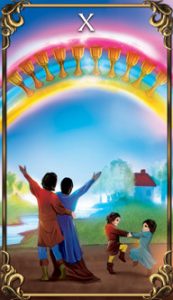 10 av bägare ❤️ Här står ett kärleksfullt par tillsammans, utsträckta armar, när deras två barn leker i närheten. De ser mot sitt hem på kullen och en vacker regnbåge på himlen fylld med tio bägare . Dessa två har sann, evig kärlek och har allt de någonsin kan önska sig – hemmet, barnen, och viktigast av allt, att uppfylla kärleken – och de delar detta band med människorna omkring dem.