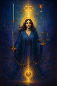Här kommer Rättvisan med sitt svärd av klarhet och sina balanserande vågskålar. Hon ställer frågor du kanske undvikit: Vad är sant för dig? Vad är du värd? Har du kompromissat med ditt hjärta?