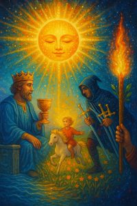 Ovanför dig vaknar Solen som ett levande väsen. Hon strålar inte bara på himlen, hon lyser inifrån dig. Hennes varma leende påminner dig om din glädjes rättmätiga plats i världen. Barnafötter trampar lekfullt mot nya stigar – oskuldsfull, fri och kraftfull.